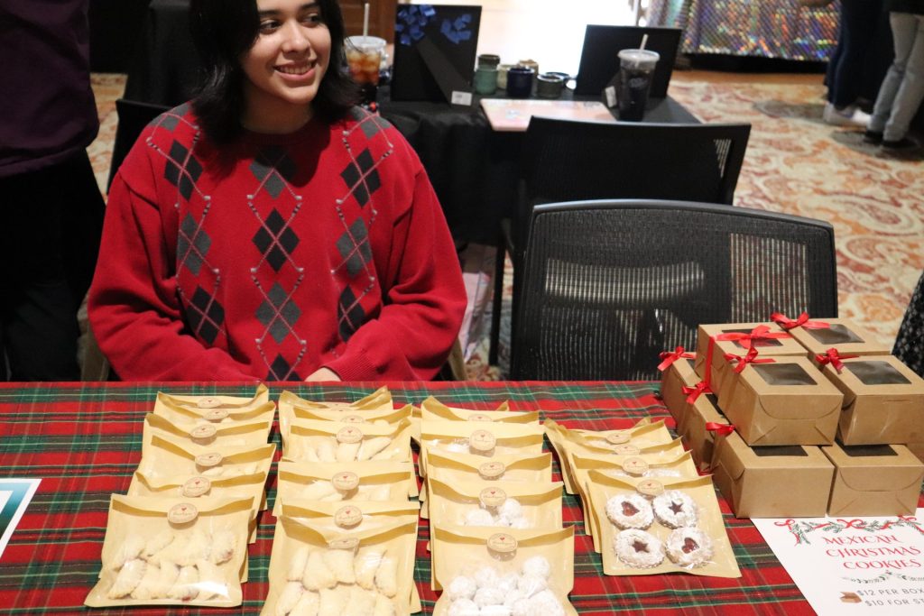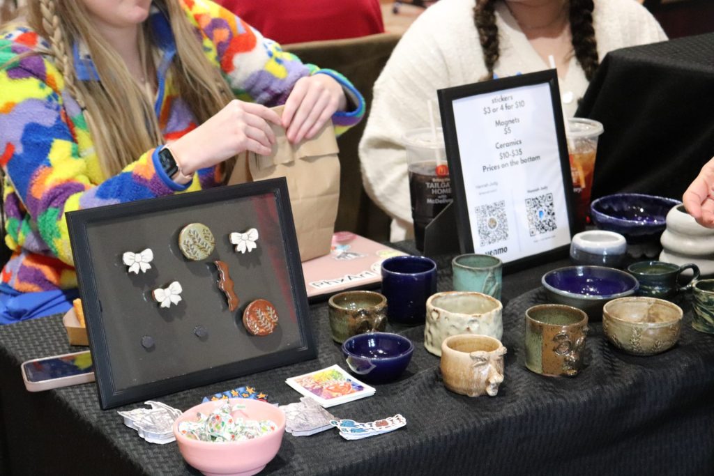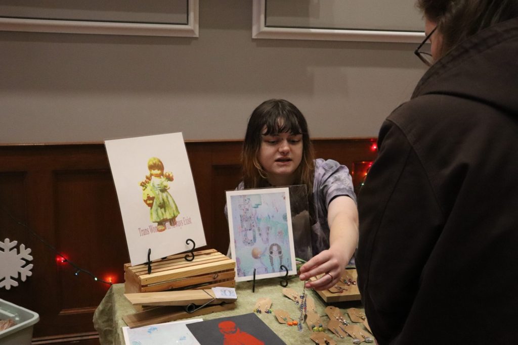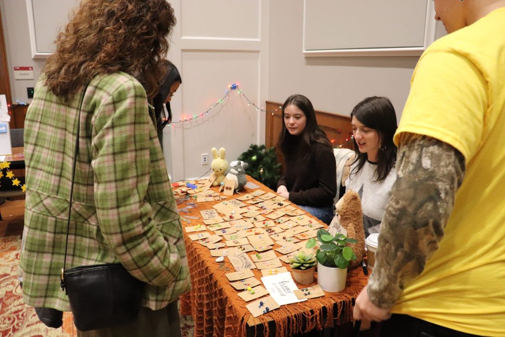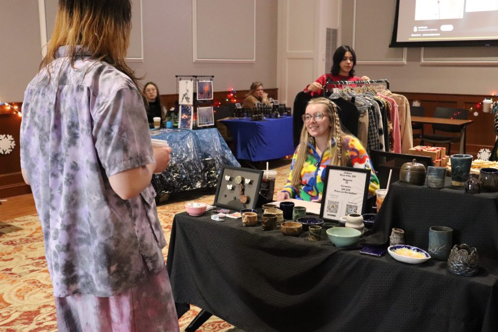 Student Hannah Judy sells ceramic creationsCeramic mugs, magnets, and more sold and created by student Hannah JudyA rack of clothes for sale at a student’s boothStudent Sophia Del Val sells homemade Mexican Christmas cookie bundlesA package of handmade Mexican Christmas cookiesStudent Becca Orjala hand-makes jewelry and keychains at her boothStudent Becca Orjala sells hairclips, keychains, and moreStudents Hope Hitch and Fallon Cross sell homemade cookiesA Christmas Tree acts as a display for a student’s keychains and goodsShaped and scented soaps are displayed in a frog-shaped bowlTransy’s Student Literary Magazine “The Transylvanian” hands out free “Bat Bite” mini editionsArtists visit each others booths, looking at Alumni Nicole’s carpet artworkStudent Latanya sells magnets and printsAlumni Morgan Hardigree sells various mediums of artworkAlumni Morgan Hardigree explains her artwork to curious studentsAlumni Anne Elizabeth sells self-designed magnets and cardsStudent Jiali Graham sells hand-drawn stickers and keychainsStudents Sarah Childers and Alice Beatty sell hand-crafted earringsStudents visit Alice Beatty at her jewelry boothDozens of trinkets turned into earrings by students Alice Beatty and Sarah ChildersTEAL (Transy’s Environmental Action League) gives away free clothes for those in needStudent Sam Schultz sells merch and editions of his comics“StripClubComics” founded by Alice Beatty and Sam Schultz sells comic magazines and merchandiseHoliday decorations accompany the tables of artworkPatrons check out student Molly Uphoff’s jewelry and crafts at the Maker’s MarketClothes and fabrics for sale, including homemade sorority merchandise