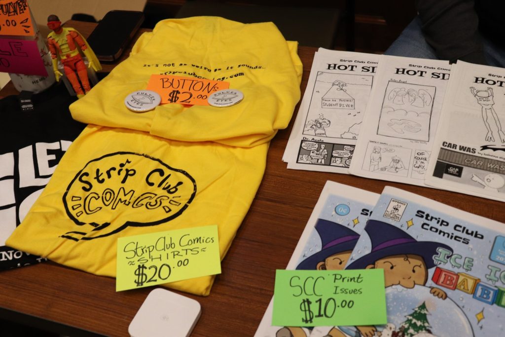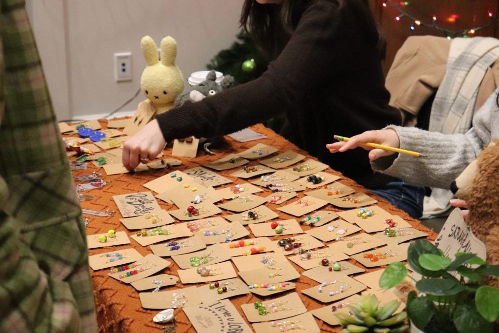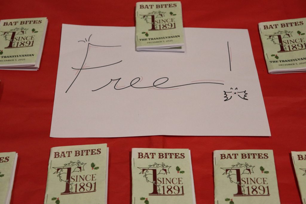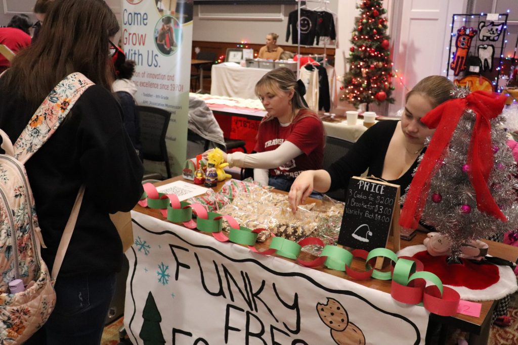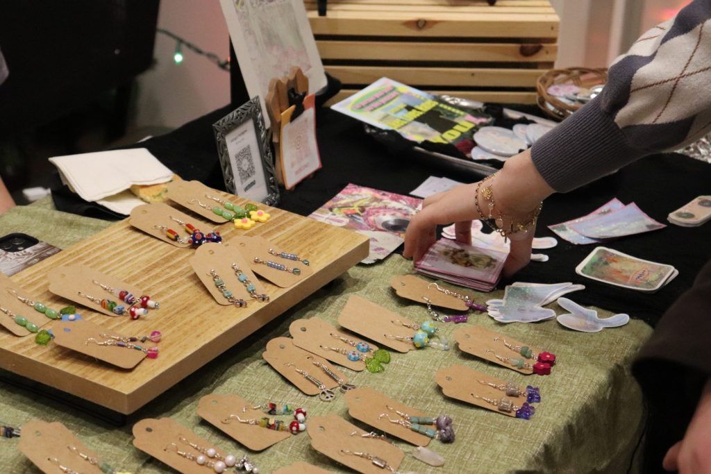 Student Hannah Judy sells ceramic creationsCeramic mugs, magnets, and more sold and created by student Hannah JudyA rack of clothes for sale at a student’s boothStudent Sophia Del Val sells homemade Mexican Christmas cookie bundlesA package of handmade Mexican Christmas cookiesStudent Becca Orjala hand-makes jewelry and keychains at her boothStudent Becca Orjala sells hairclips, keychains, and moreStudents Hope Hitch and Fallon Cross sell homemade cookiesA Christmas Tree acts as a display for a student’s keychains and goodsShaped and scented soaps are displayed in a frog-shaped bowlTransy’s Student Literary Magazine “The Transylvanian” hands out free “Bat Bite” mini editionsArtists visit each others booths, looking at Alumni Nicole’s carpet artworkStudent Latanya sells magnets and printsAlumni Morgan Hardigree sells various mediums of artworkAlumni Morgan Hardigree explains her artwork to curious studentsAlumni Anne Elizabeth sells self-designed magnets and cardsStudent Jiali Graham sells hand-drawn stickers and keychainsStudents Sarah Childers and Alice Beatty sell hand-crafted earringsStudents visit Alice Beatty at her jewelry boothDozens of trinkets turned into earrings by students Alice Beatty and Sarah ChildersTEAL (Transy’s Environmental Action League) gives away free clothes for those in needStudent Sam Schultz sells merch and editions of his comics“StripClubComics” founded by Alice Beatty and Sam Schultz sells comic magazines and merchandiseHoliday decorations accompany the tables of artworkPatrons check out student Molly Uphoff’s jewelry and crafts at the Maker’s MarketClothes and fabrics for sale, including homemade sorority merchandise