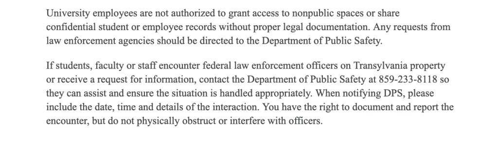 Because Transy is a private institution, ICE would be required to obtain a signed judicial warrant to enter the campus center or any academic or residential buildings. But nothing is stopping ICE from approaching people in public spaces. Outdoor spaces, even on Transy’s private property, may not necessarily offer constitutional protection from warrantless searches—there would typically not be a legal expectation of privacy on campus green spaces. If ICE agents are spotted on campus, advocates suggest that anyone concerned should stay inside a university building.