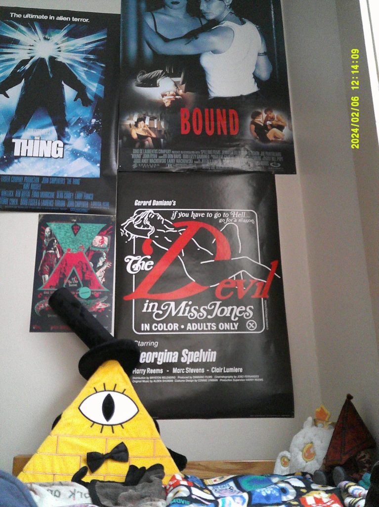 When I’m home, I sleep not in the embrace of some romantic partner, but within the comforting, collective gaze of my favorite shitty slashers and A24 collector’s editions. Phantom of the Paradise sits below the entirety of Twin Peaks. The unknown Goatsucker under Lars Von Trier’s Antichrist. They all have a home on my shelf. The only thing “allo” about me remains the tire-scuffed Allosaurus watching me from beside my Fire Walk With Me themed lava lamp. I am content.