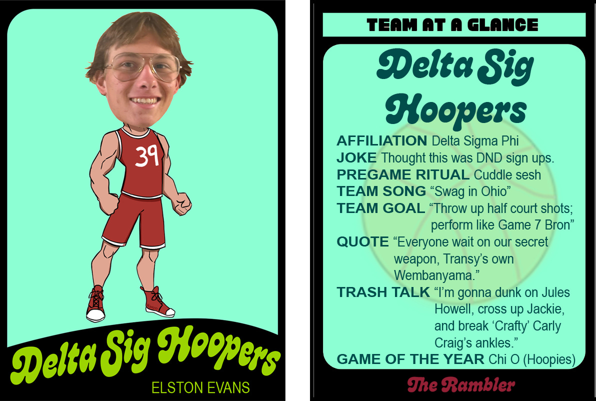 The boys from Sig battled in the A-League last year but decided their energy ran more to B this season after star John Buckle took his talents to Phi Tau A. How will the Chi Omega Hoopies—longtime B-League stalwarts—handle the new kids on the block? Already there has been some animosity between D SIG and CHI O. Standout D SIG sophomore Cash “Money” Doolin called out a few of the Hoopies starters by name (see card above for just how ruthless the trash talk is getting).