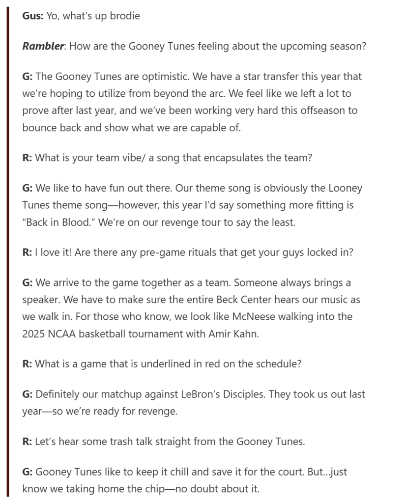 Asked about Dickman’s comments, LeBron’s Disciples star Collen “the General” Gudorf said he had a lot of respect for the Goon squad. “But they said the same thing after the first game last year,” he said. “And look what happened in the playoffs.”